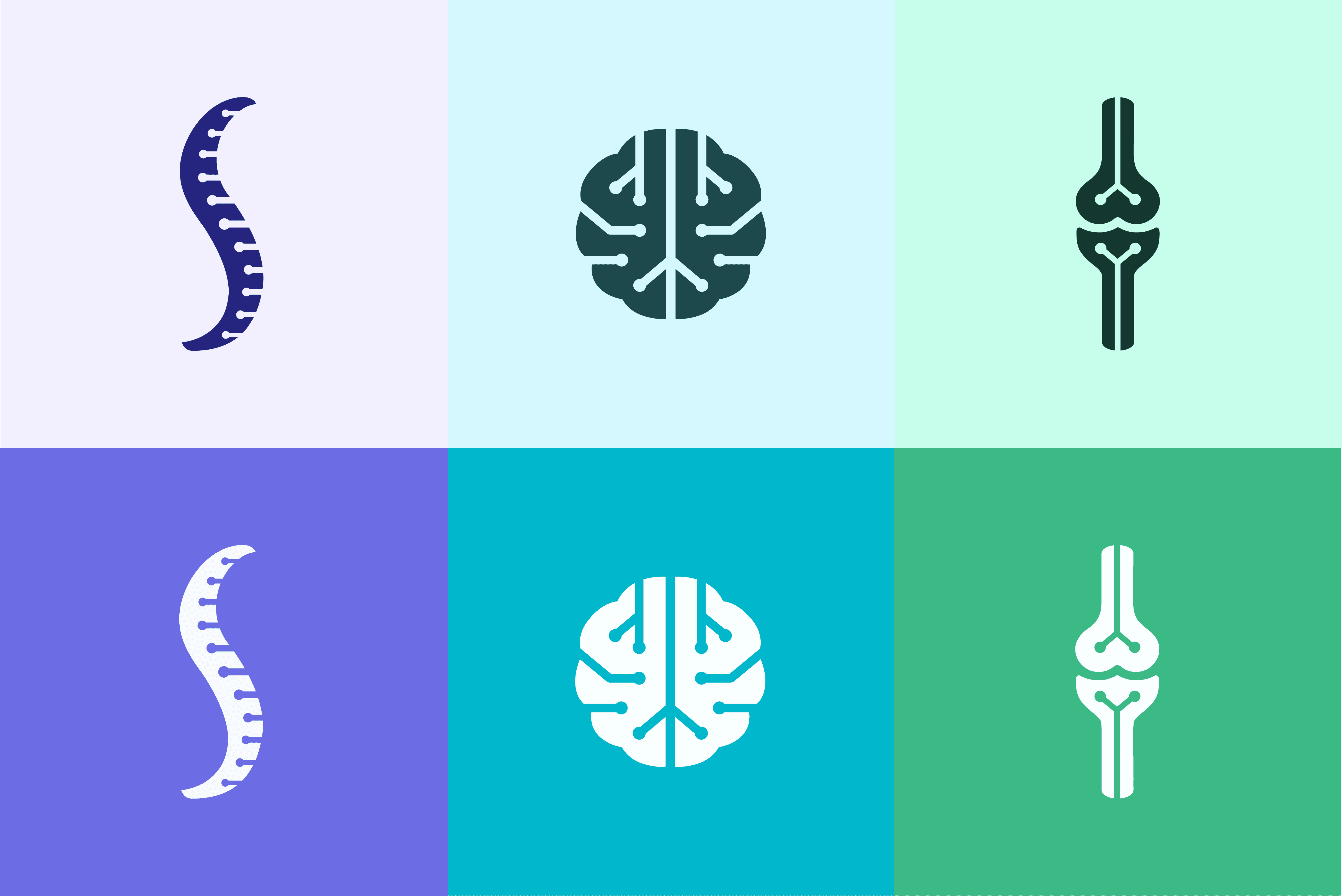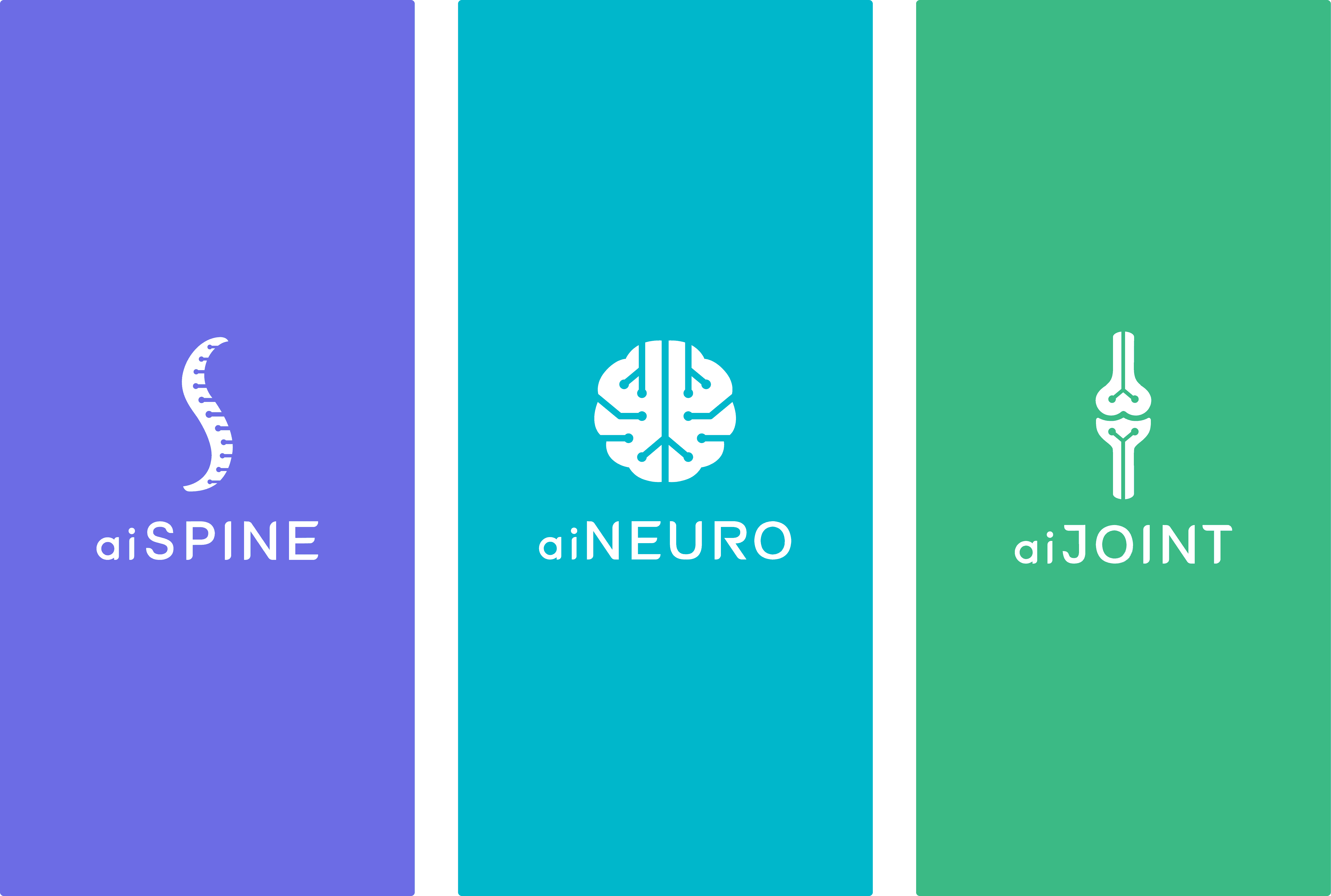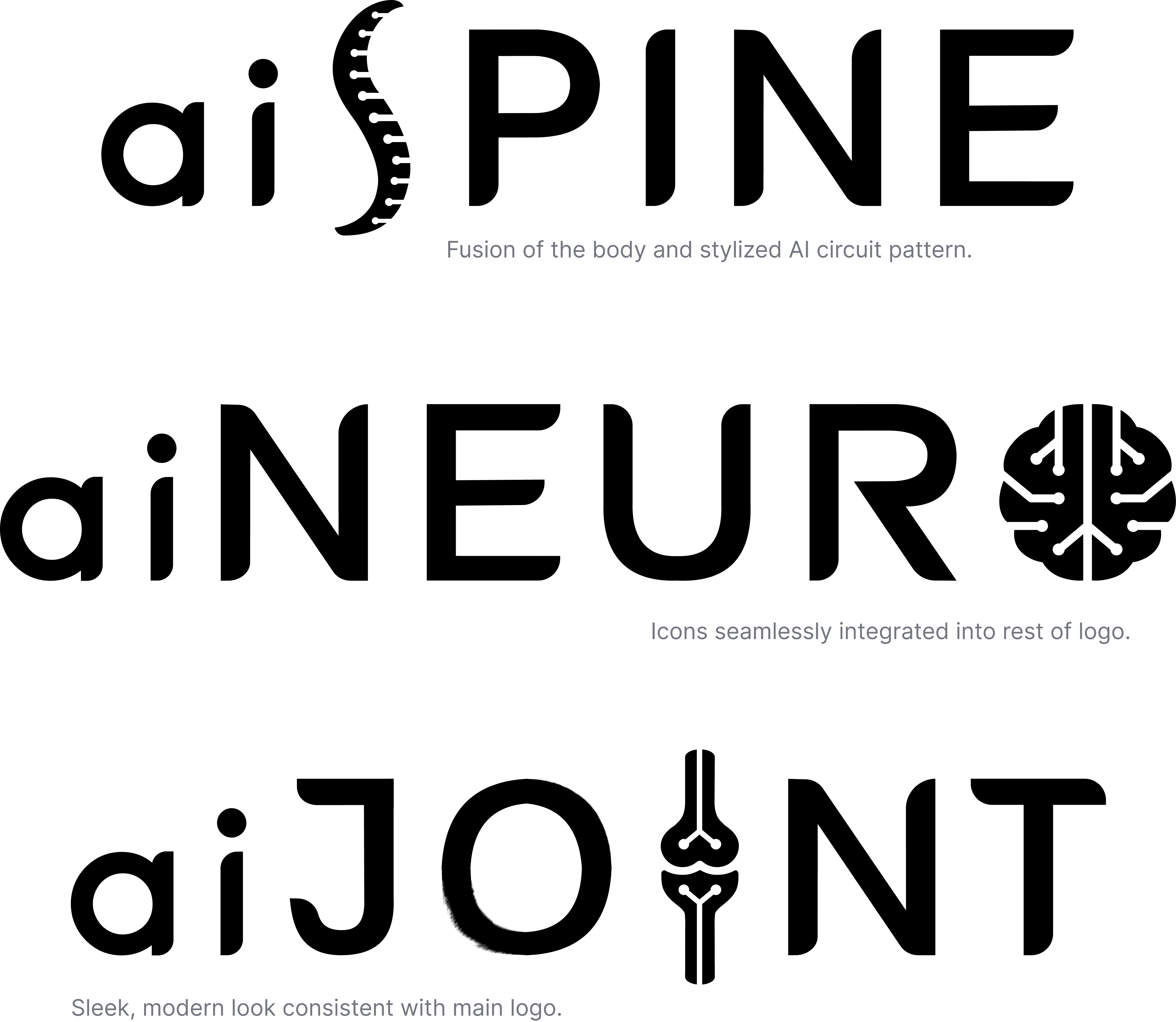 In addition to the main logo, I created three individual logos for AIH's products: aiSpine, aiNeuro, and aiJoint. My main focus while making these were to have cohesive elements tying the three logos together while still making them unique to each other. Thus, each logo has a body part integrated as a letter into the main logo, with a stylized circuit nodes reminiscent of smart technology focus of the company.