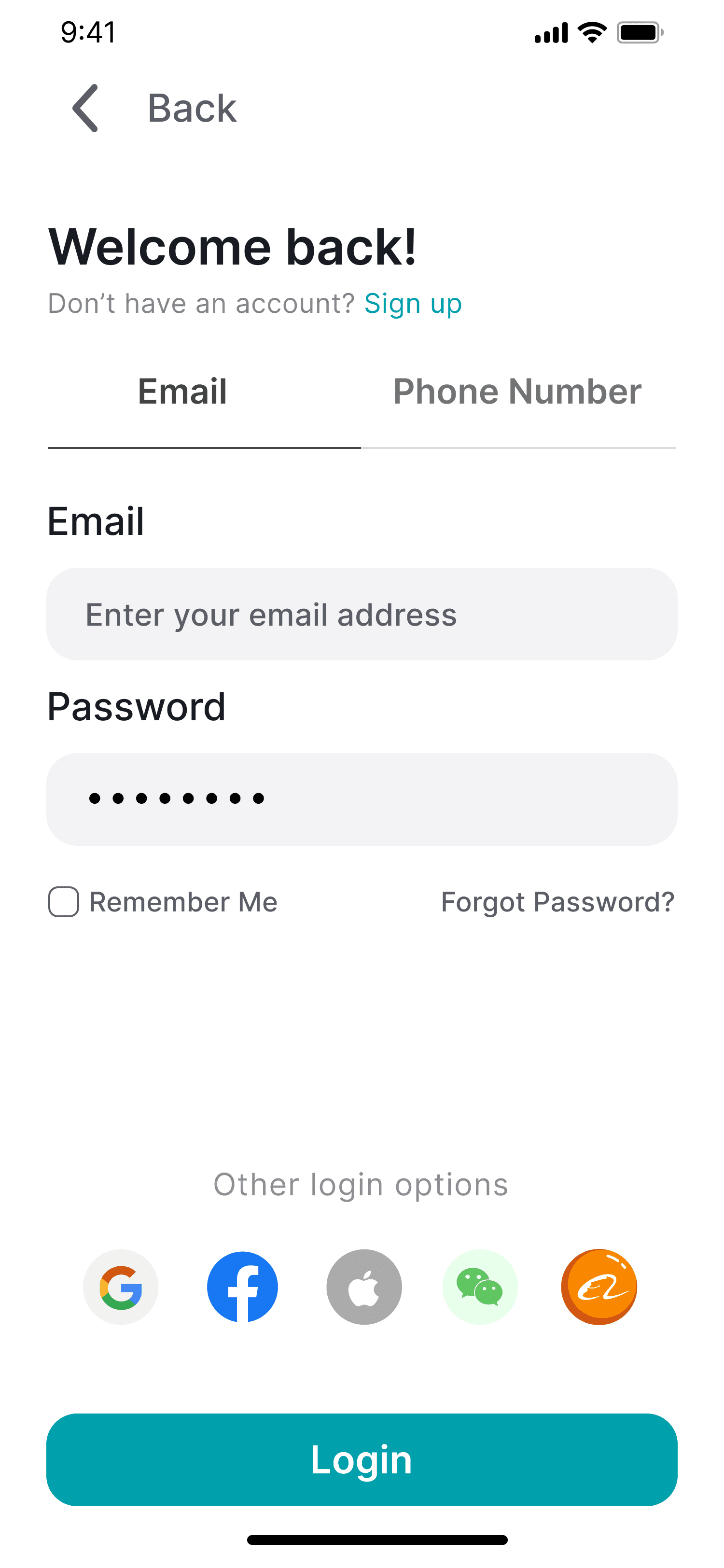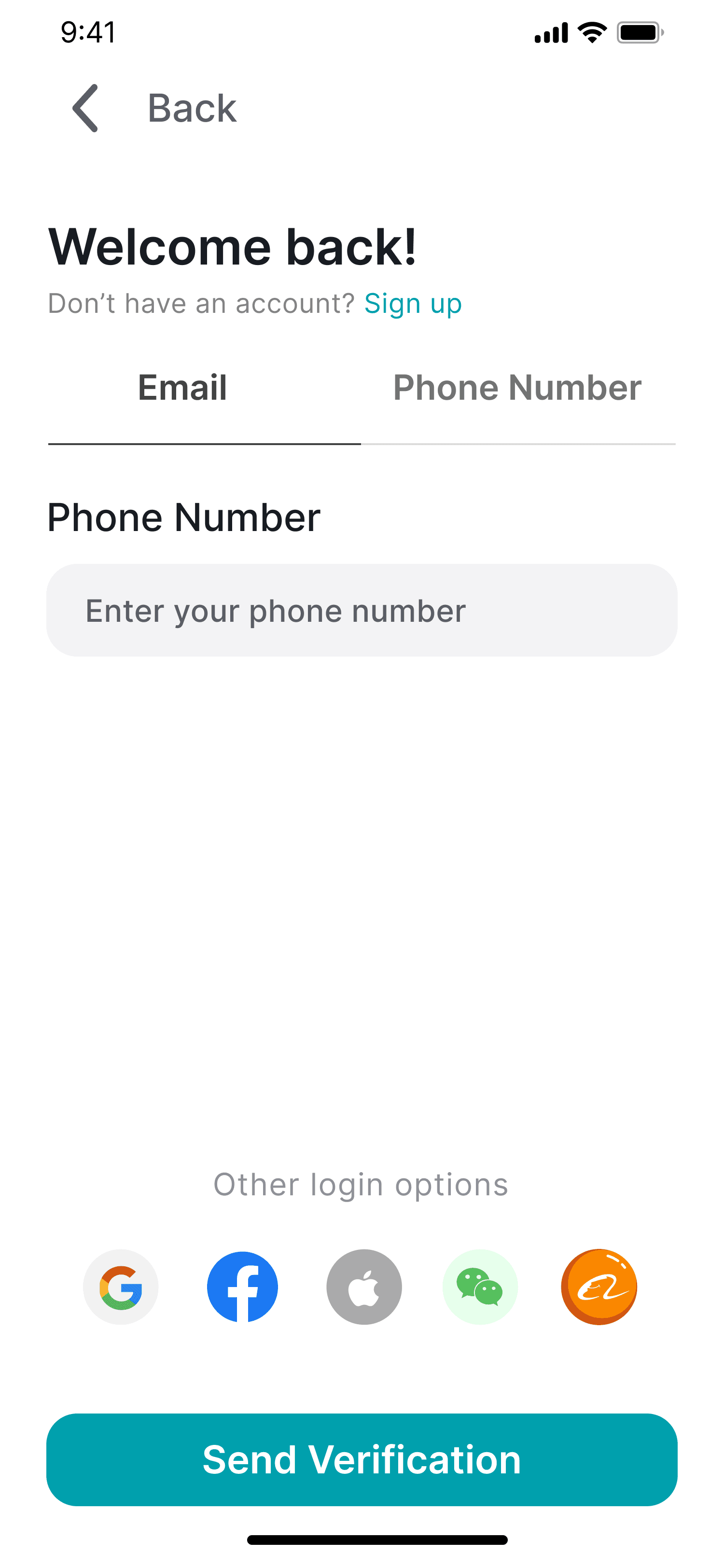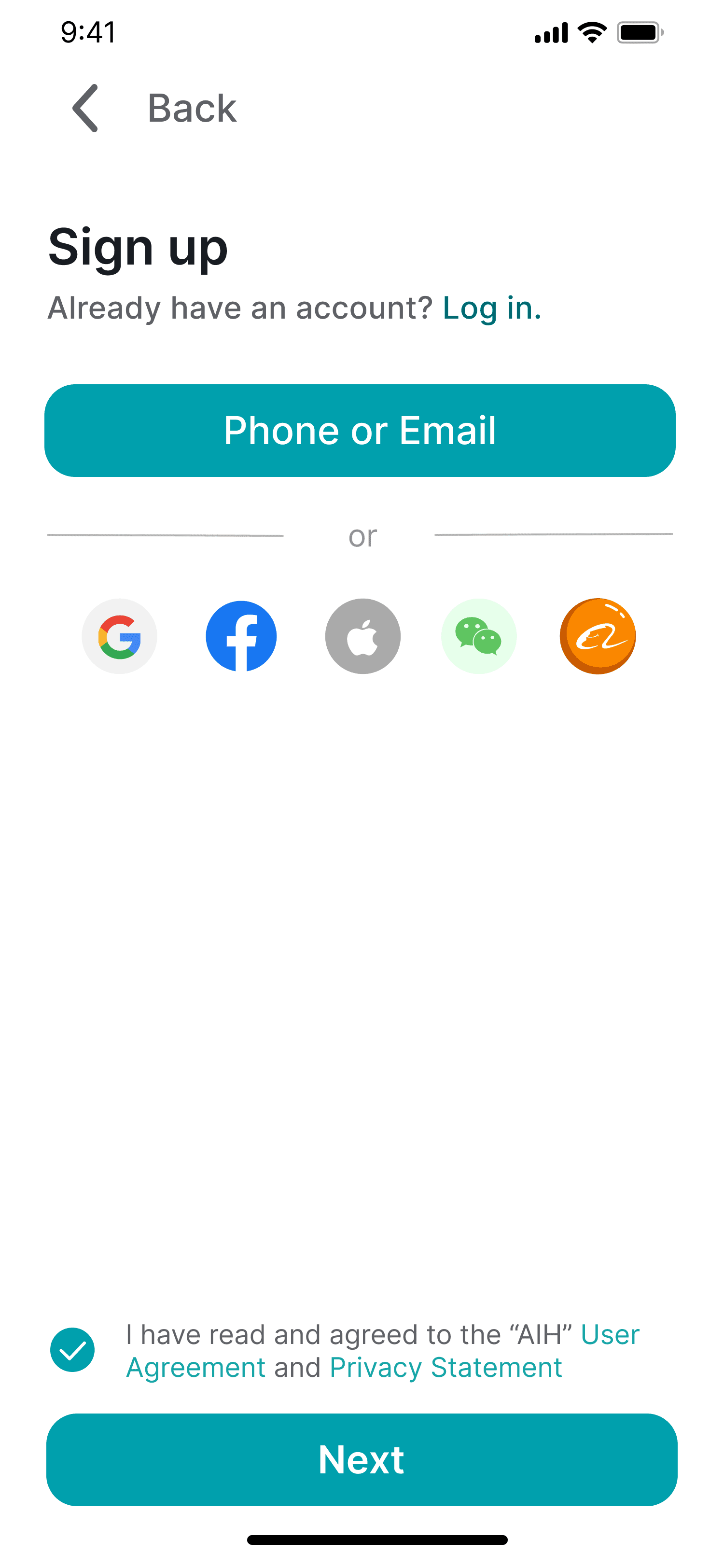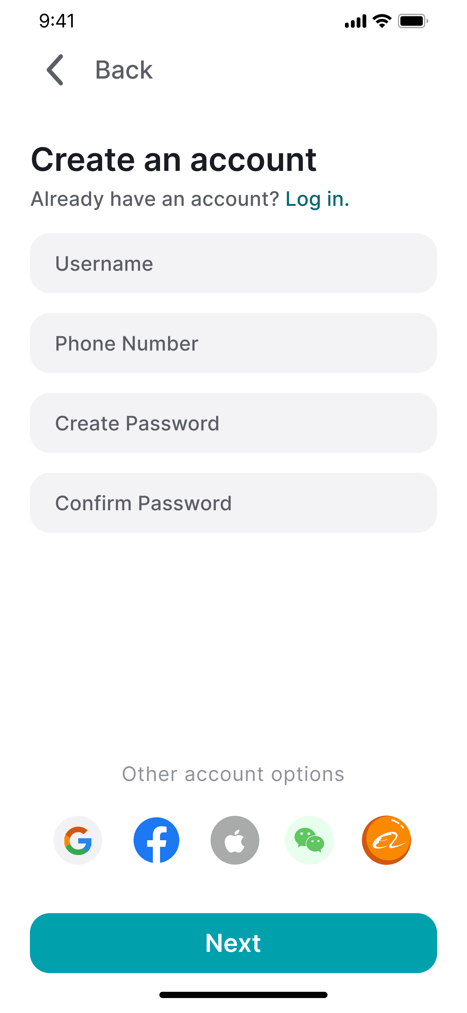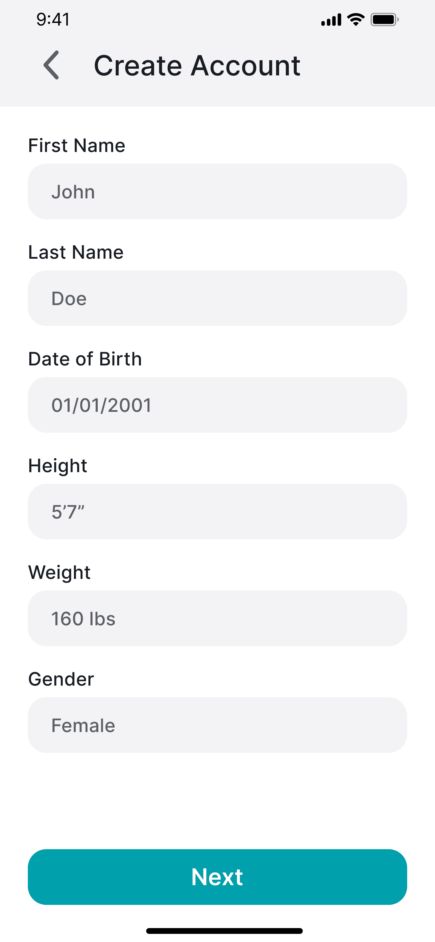 Basic user flow including splash screens, account creation or login, and collection of profile information.
