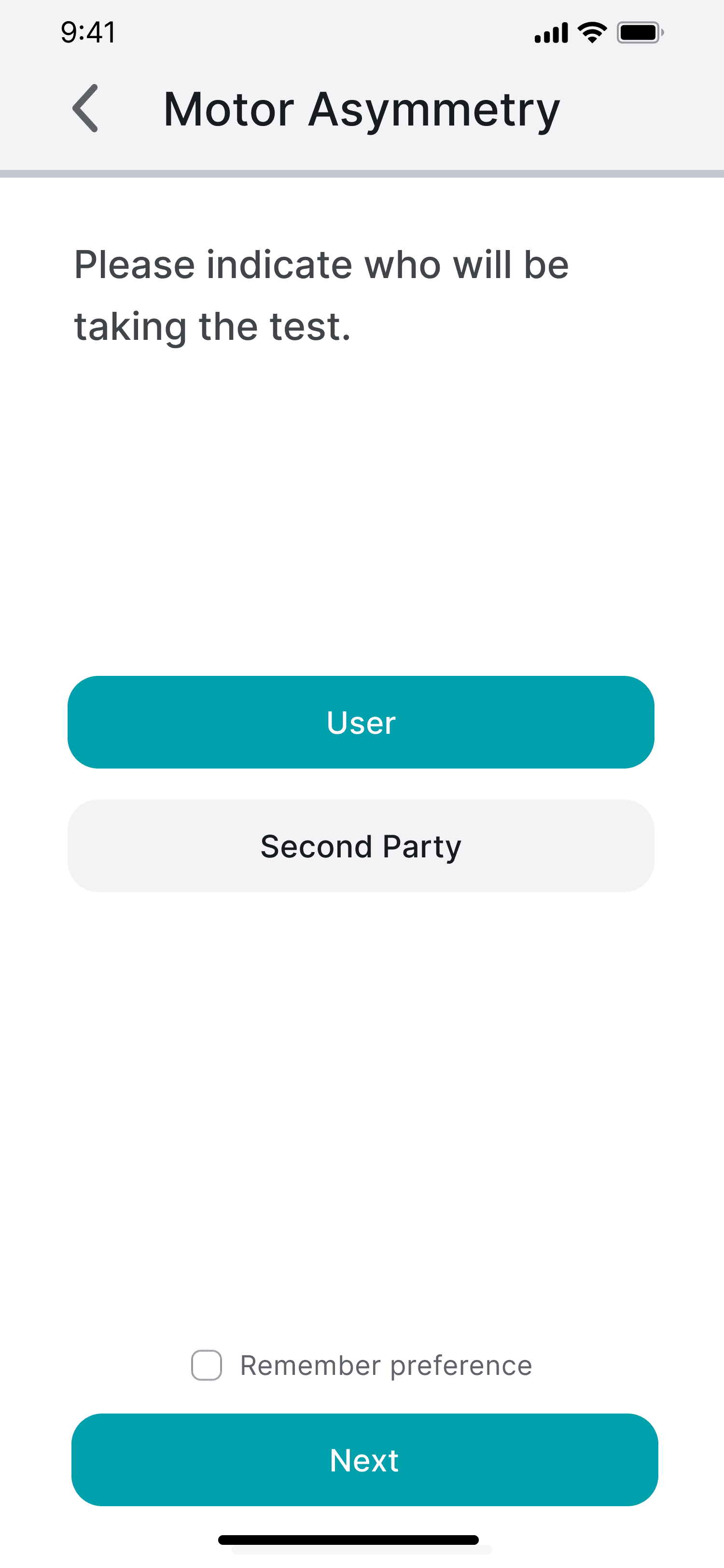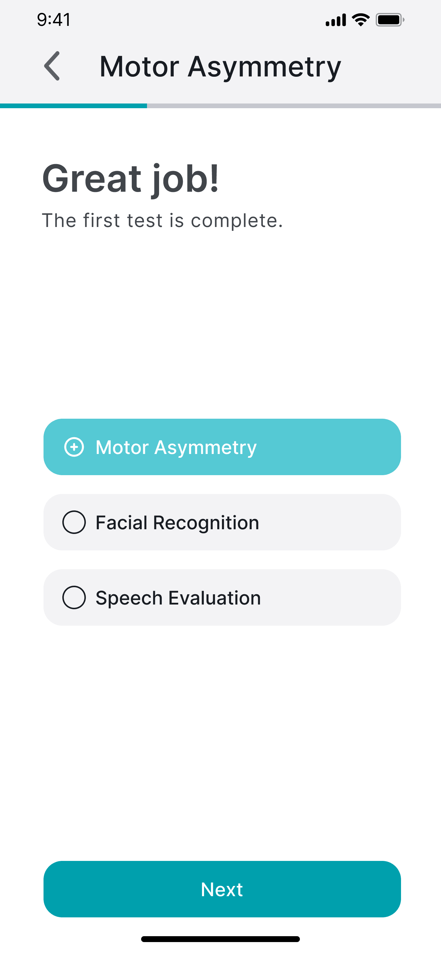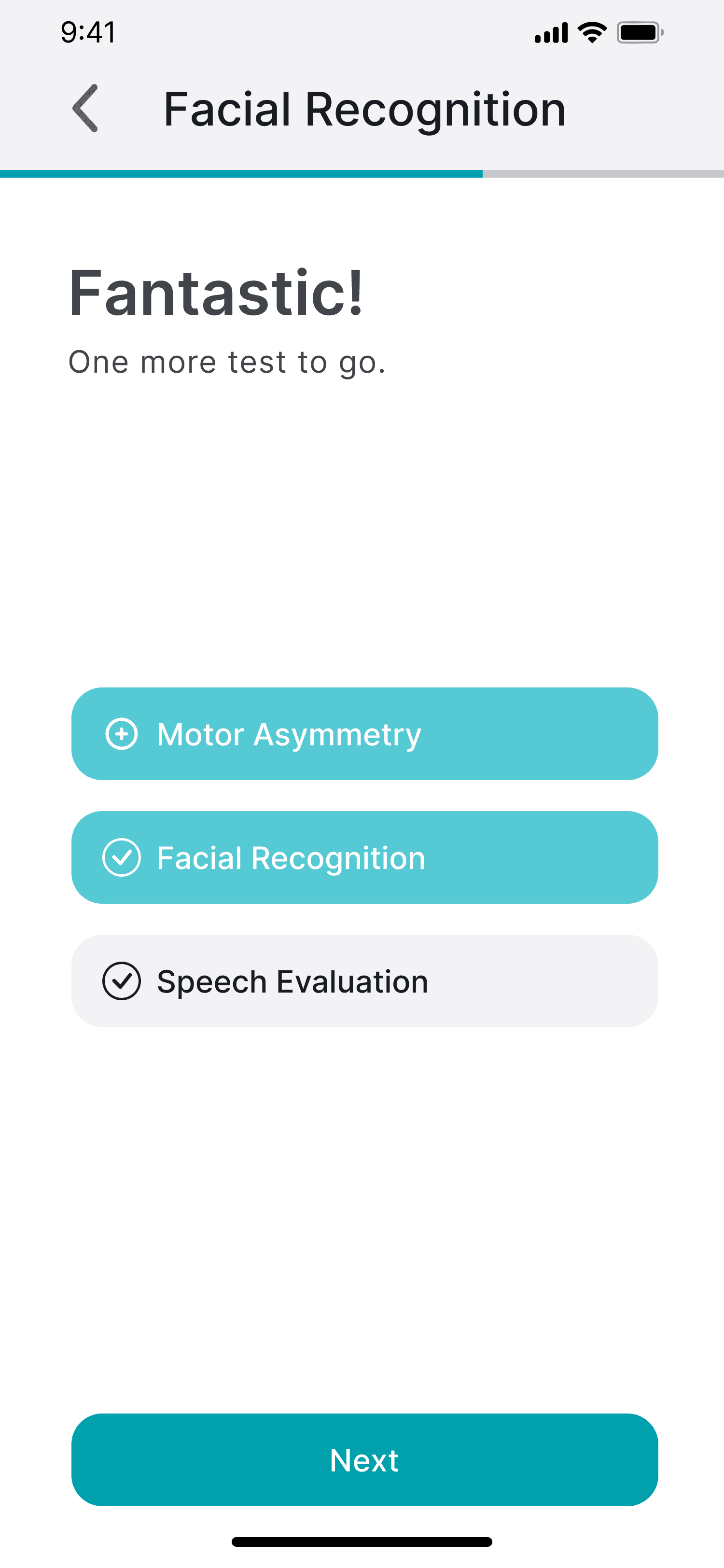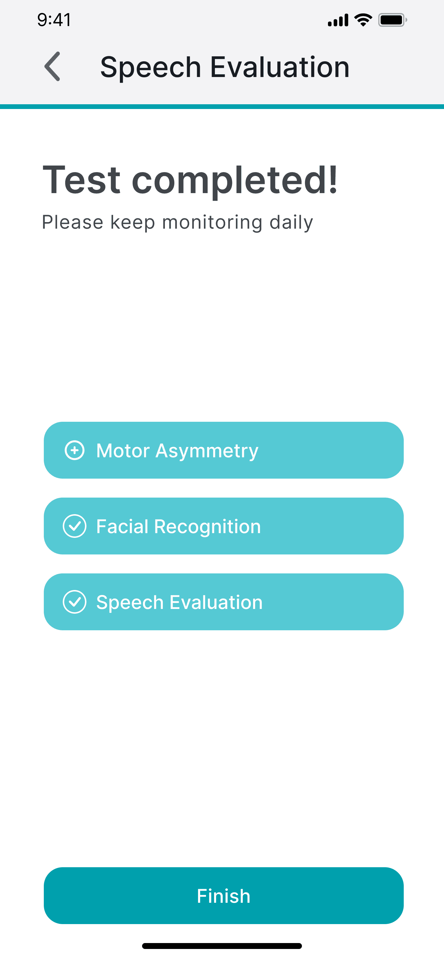 A mobile version of the FAST test, which is an acronym used for stroke detection. This test uses facial recognition to detect asymmetry, tests for motor asymmetry in the user's hands, and speech difficulty.
