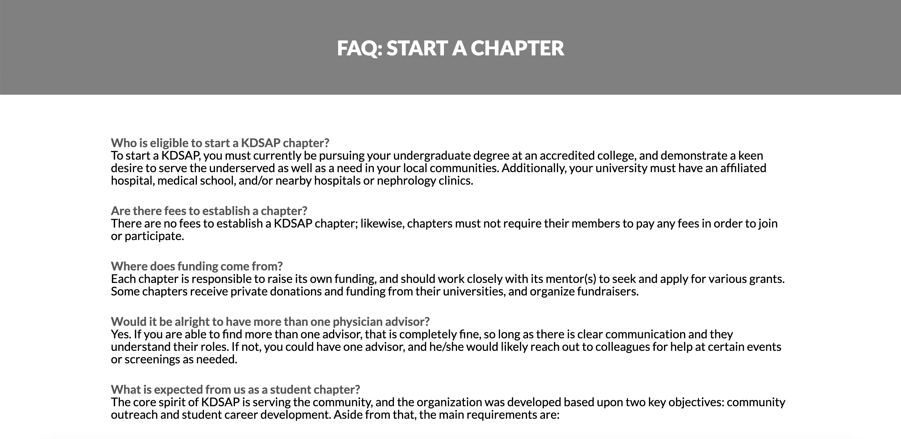 I converted the FAQ sections spread across 3 pages into one comprehensive page with visual hierarchy to guide students who are interested in creating a chapter.