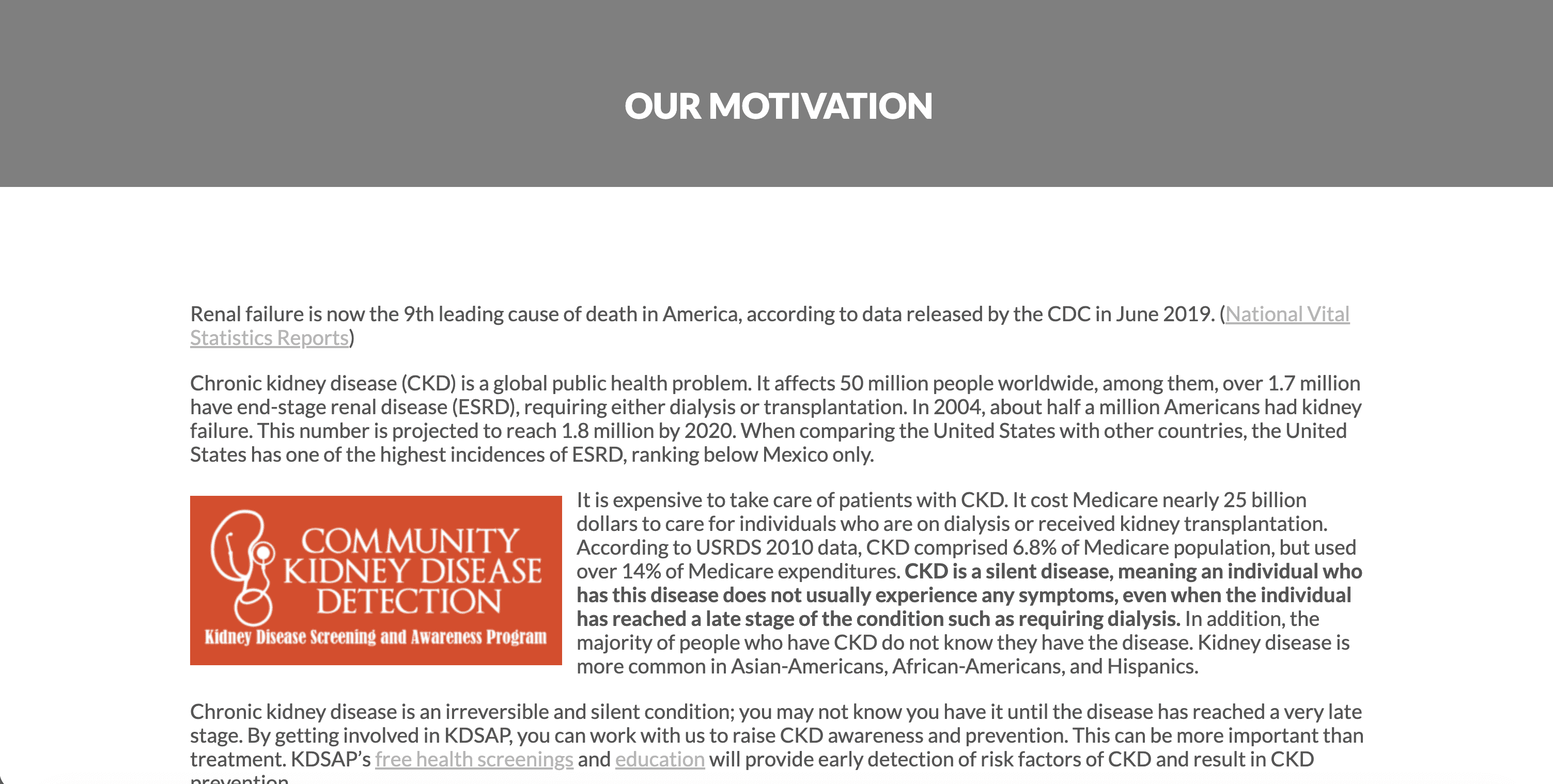 Several pages consisted of blocks of text that lacked visual hierarchy and contained redundant information. This increases the barrier between the audience becoming interested or motivated to learn more about the importance of CKD.