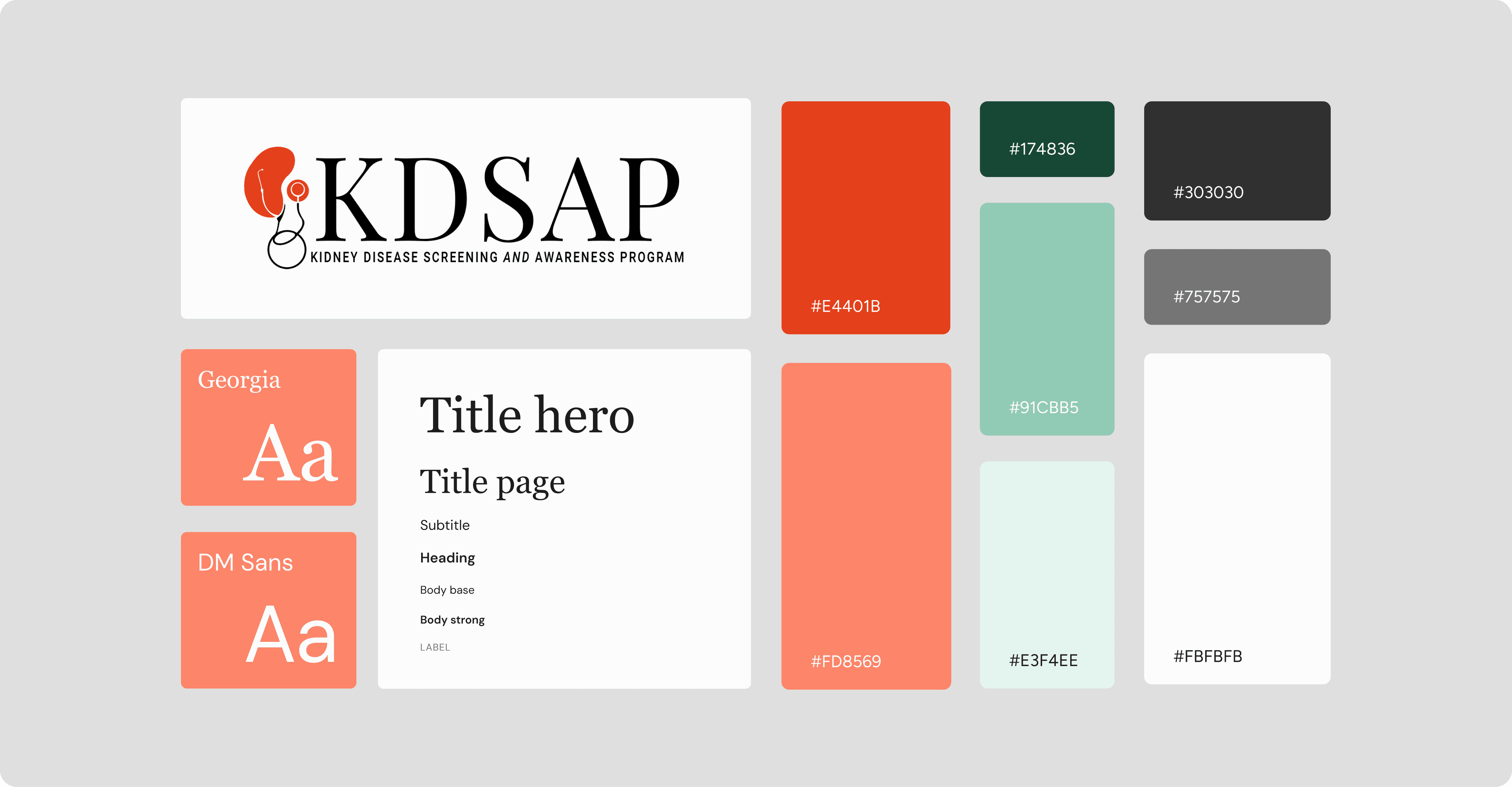 KDSAP already has an established logo and brand color, so I sought to defined the color and typography based off this precedent. After looking through other branding from medical organizations (WebMD, Mayo Clinic, etc.), I chose a traditional serif font to convey credibility and to reflect the logo. I paired it with a more playful sans serif font for the body text.